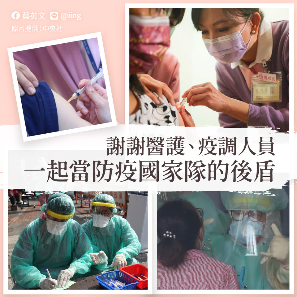 此外,蔡英文也指出,在各個不同的崗位,都有最辛苦的防疫國家隊,全力以赴,守護全國人民健康。在快篩站,有穿上防護衣、戴起護目鏡的醫護人員,頂著炙熱的大太陽,努力替民眾採檢。在醫院、在集中檢疫所、在各地的衛生局及衛生所裡,也有不斷加班守護患者健康的醫護人員,以及徹夜釐清確診者足跡的疫調人員。你們每一位都是防疫的最大功臣。