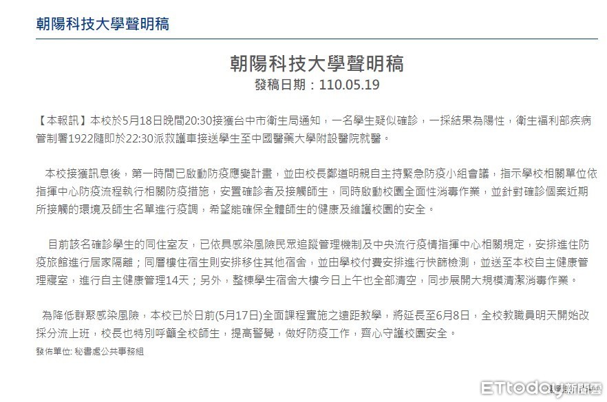 台中朝陽科技大學驚傳有學生確診,校方也隨後發出聲明稿,5月18日晚間20:30接獲台中市衛生局通知,一名學生疑似確診,一採結果為陽性,衛生福利部疾病管制署1922隨即於22:30派救護車接送學生至中國醫藥大學附設醫院就醫。