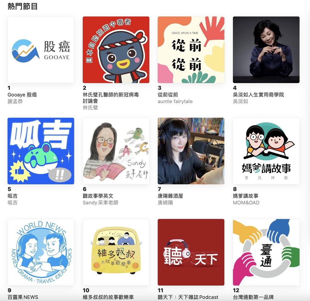 根據APPLE Podcast排行榜顯示,像是「從前從前」、「聽故事學英文」、「媽爹講故事」這類的兒童故事類排行皆急速飆升,佔據百大排行榜超過1/3。顯示許多爸媽在家求清淨又不想讓孩子看電腦太久,轉而以收聽Podcast作為數位學習工具之一,也不會被孩子們的「爸爸、媽媽,我好無聊」等話給淹沒了雙耳。