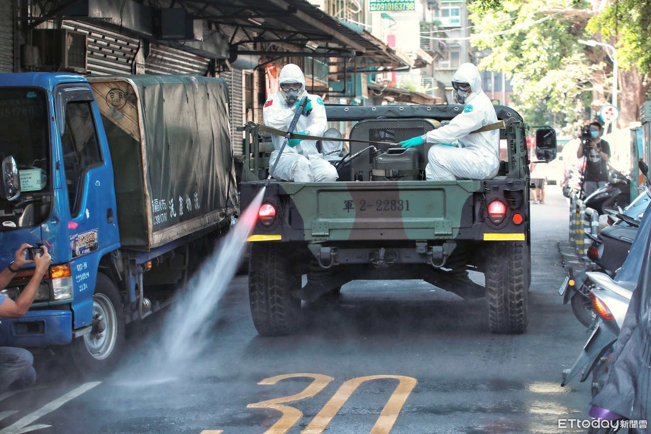 ▲國軍化學兵於萬華執行消毒任務。(圖/記者周宸亘攝)