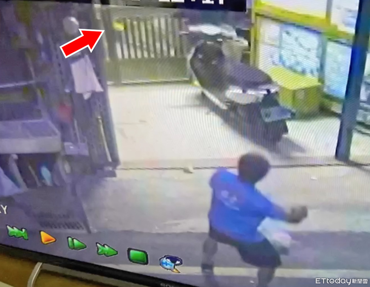 ▲17日晚間陳姓里長酒過三巡,提著自家種的馬鈴薯到張男家外狂丟,馬鈴薯卡在鋁門上(箭頭處)。(圖/記者蔡佩旻翻攝)