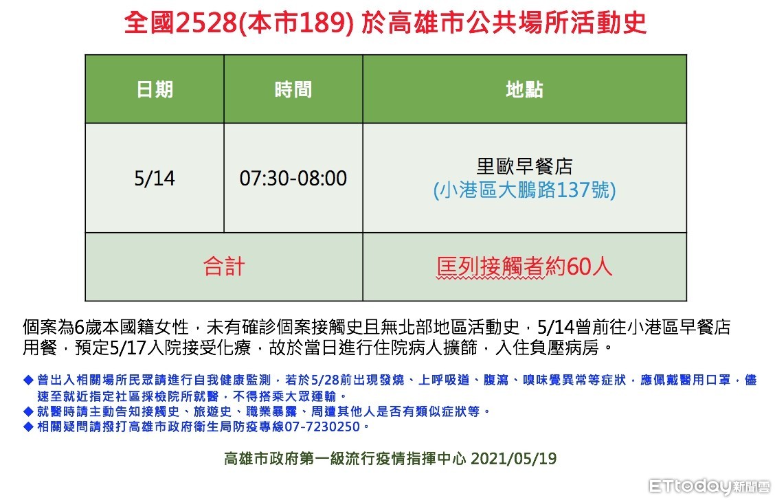 衛生局表示,該個案未有確診個案接觸史且無北部地區活動史,5/14曾前往小港區早餐店用餐,由於預定5/17入院接受化療,故於當日進行住院病人擴篩,入住負壓病房。