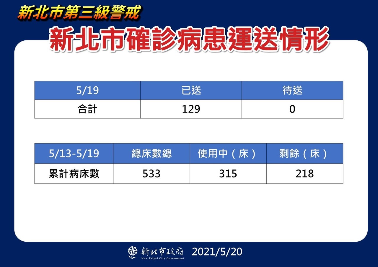 中央流行疫情指揮中心20日公布國內新增286例本土確診個案,新北市新增157人,以中和40例最多。新北市長侯友宜於記者會表示,新北市昨天確診129個案,包括輕症、無症狀以及重症者,昨晚已全部運送完畢,目前新北醫療能量,總共533床,使用中的有315床,還剩下218床,「醫療能量目前都是夠的。」
