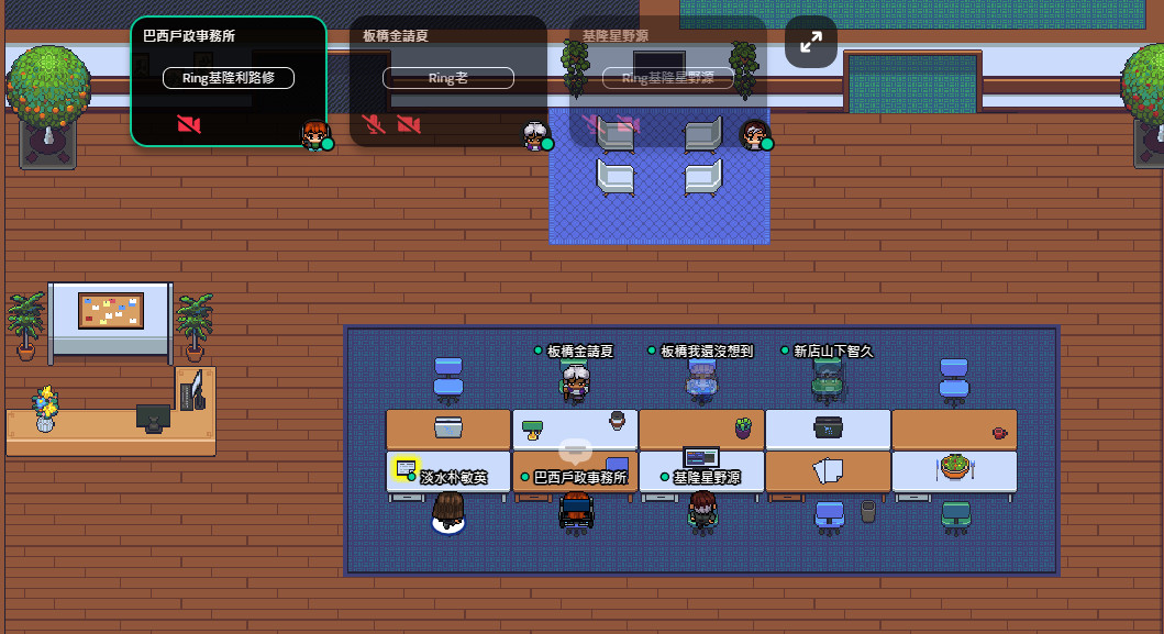 由於介面是採像素圖案的設計,往往讓人有種在玩遊戲的感覺,但實際上的會議功能很人性,若是角色走到一起便可以使用語音對話,若角色走遠了,對話的聲音也會漸弱,沒有進入會議空間的人,也無法聽見會議室中的對話,是不是像極了平時在公司角落聊八卦的情景?如果需要一點辦公的感覺,也可以坐在「座位上」,上頭顯示的綠燈代表在線,你也隨時都可以走向其他人並展開對話。