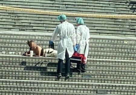 新北市新莊體育館前,有民眾發現一名穿著低胸運動背心辣妹,趴在館前階梯上曬太陽,但卻沒有戴上口罩,消防救護人員獲報後到場,辣妹表示身體沒有不適,除了手指有傷口,救護人員幫她換了紗布後勸離,警方呼籲,公共場所未戴口罩將依《傳染病防治法》開罰3000-15000元。