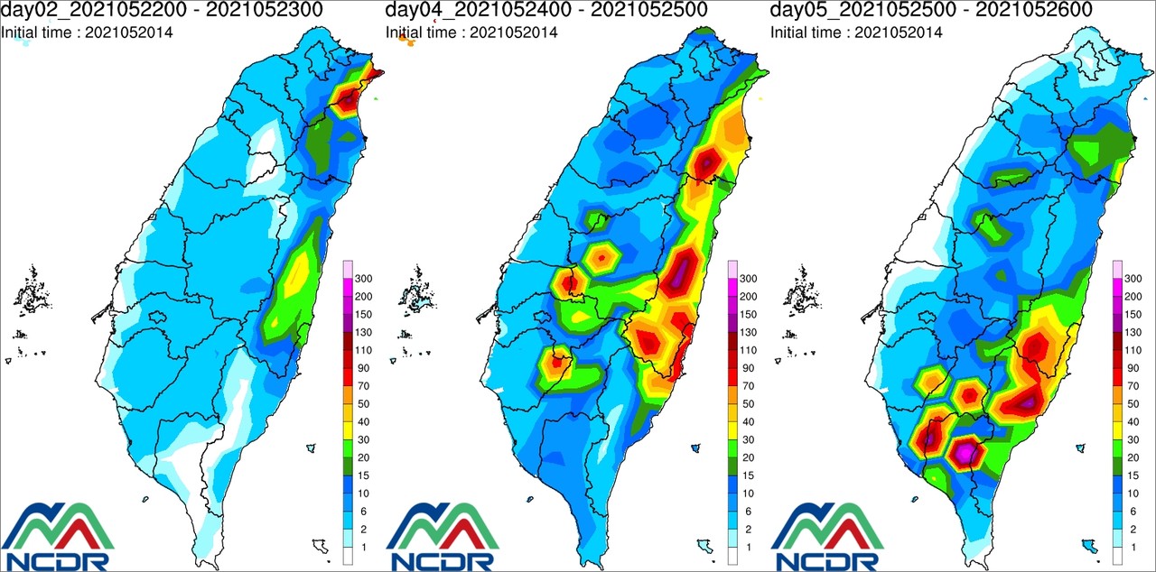 預計這波鋒面22日(周六)仍在台灣北部海面,清晨中南部沿海地區有局部短暫陣雨,東半部及北部地區有局部短暫雷陣雨,其他地區為多雲時晴的天氣,午後各地山區有局部短暫雷陣雨並有局部大雨發生機率。23、24日(周日、下周一)鋒面往北移至東海附近,水氣減少,各地大多為多雲時晴的天氣,僅花東地區有局部短暫陣雨,但午後北部、宜蘭地區及其他山區仍有局部短暫雷陣雨。