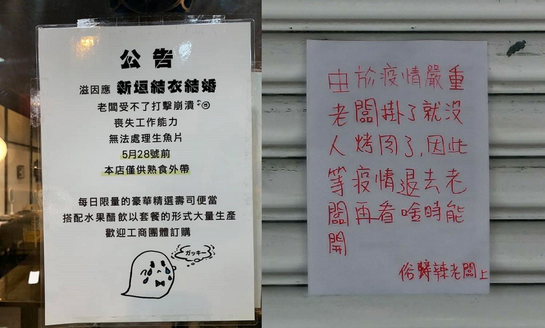 網友們在臉書「路上觀察學院」貼出店家的停業公告,有老闆寫道「由於疫情嚴重,老闆掛了就沒人烤肉了,因此等疫情退去,老闆再看啥時能開,俗辣老闆上」,另外也有老闆表示「老闆怕死,回家耍廢,進行人與人之間的連結」。