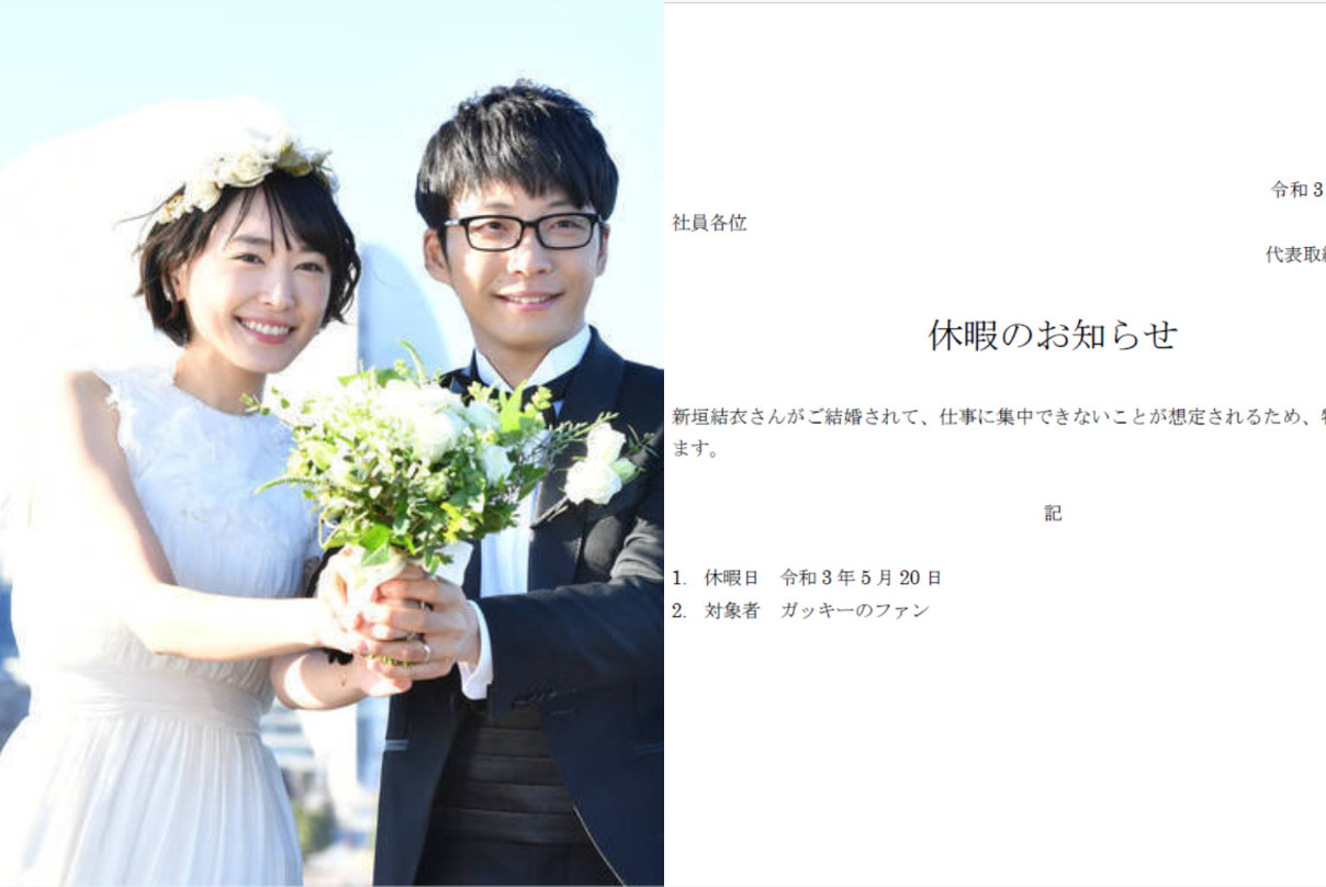 讓網友與員工們都沒想到的是,在短短不到一小時後,米村馬上在推特上貼出一張公司內部公告,上面直接寫著,「由於新垣結衣結婚,導致無法專心工作,因此提供同仁特別休假一天。」休假日是5月20日,適用對象更是搞笑寫著,「新垣結衣的粉絲」。