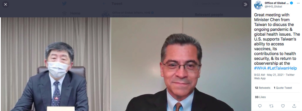 美國衛生部長貝西拉(Xavier Becerra)21日與衛福部長陳時中舉行視訊會議,會後美國衛生部於推特發文明確表示,「美國支持台灣獲得疫苗」,並支持重返世界衛生大會觀察員。