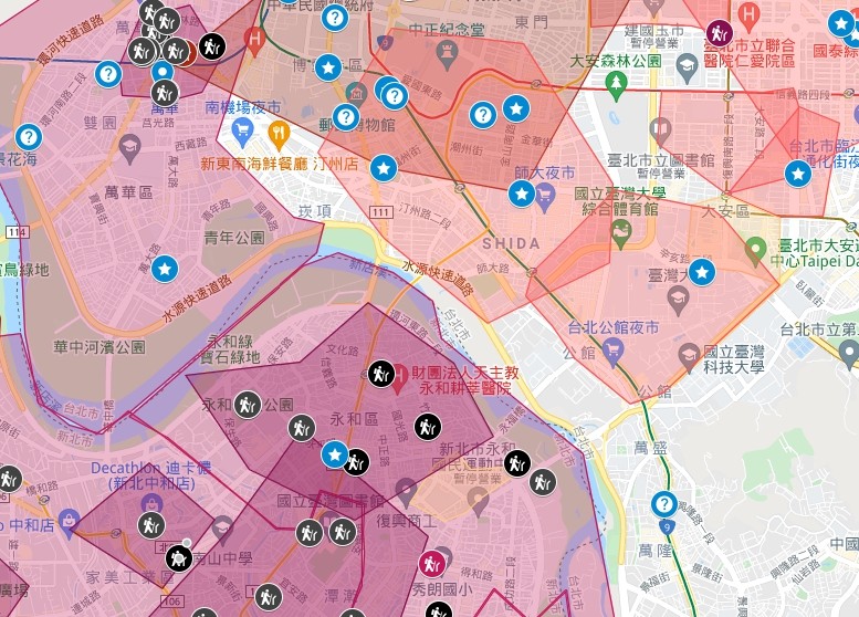 值得一提的是,透過地圖可以發現,公館一帶及萬華、永和中間還有一條「夾道」,雖然兩側足跡遍布,但該條路線目前仍相對安全,特殊景象形同「摩西分海」。