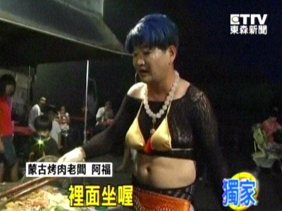 夜市裡賣蒙古烤肉的攤位前擠滿人潮,大家拿起相機拼命拍,全都因為老闆一身奇裝異服,在頭上戴了頂亮藍色假髮,上半身穿黑色蕾絲緊身洞洞裝,還有比基尼,腰部圍上舞裙,雙腿再套上不同顏色的網襪,還踩著高跟鞋,露出圓滾滾的大肚楠,一個大男人男扮女裝,一點都不害臊。