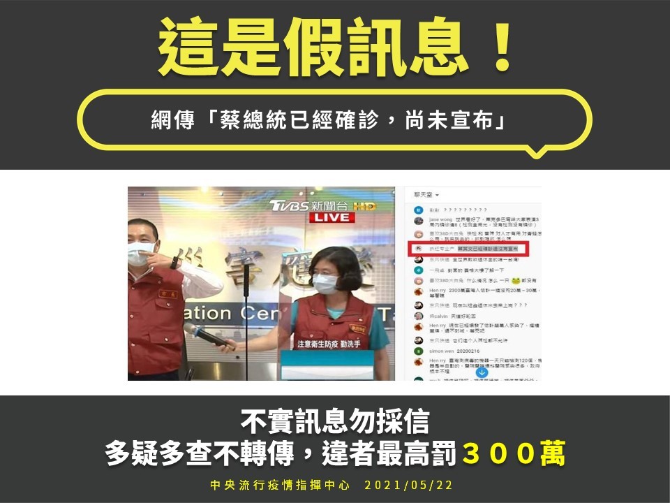 中央流行疫情指揮中心今(22)日表示,網路直播新聞聊天室一則留言內容提及「蔡英文已經確診還沒有宣布」,其言論極端悖離事實,嚴重誤導國人,意圖造成社會混亂及國人恐慌,請民眾勿再轉傳與散布不實訊息,以免觸法遭罰。