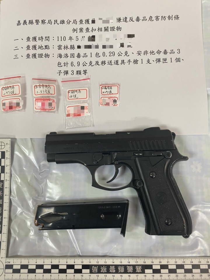 ▲嘉義縣警方查獲毒販並起出槍械及相關違禁藥品。(圖/記者翁伊森翻攝)