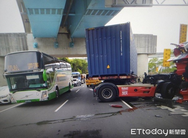 ▲▼貨櫃車撞倒限高標誌也波及旁邊大客車,造成當地交通壅塞。(圖/記者楊熾興翻攝)
