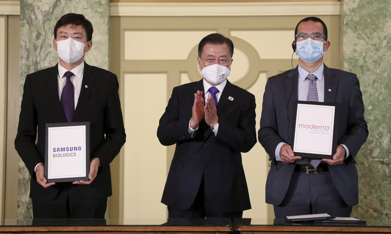 南韓總統文在寅前往華府白宮會晤美國總統拜登,除協商韓半島(朝鮮半島)、對美投資半導體與電池,雙方還討論新冠疫苗夥伴合作,規劃將南韓打造為全球疫苗的生產基地之一。為此兩國簽署4項契約與備忘錄,其中包含南韓三星與美國藥廠莫德納簽署代理生產契約,只要位於南韓的工廠獲得疫苗原液供應,即可投入生產。