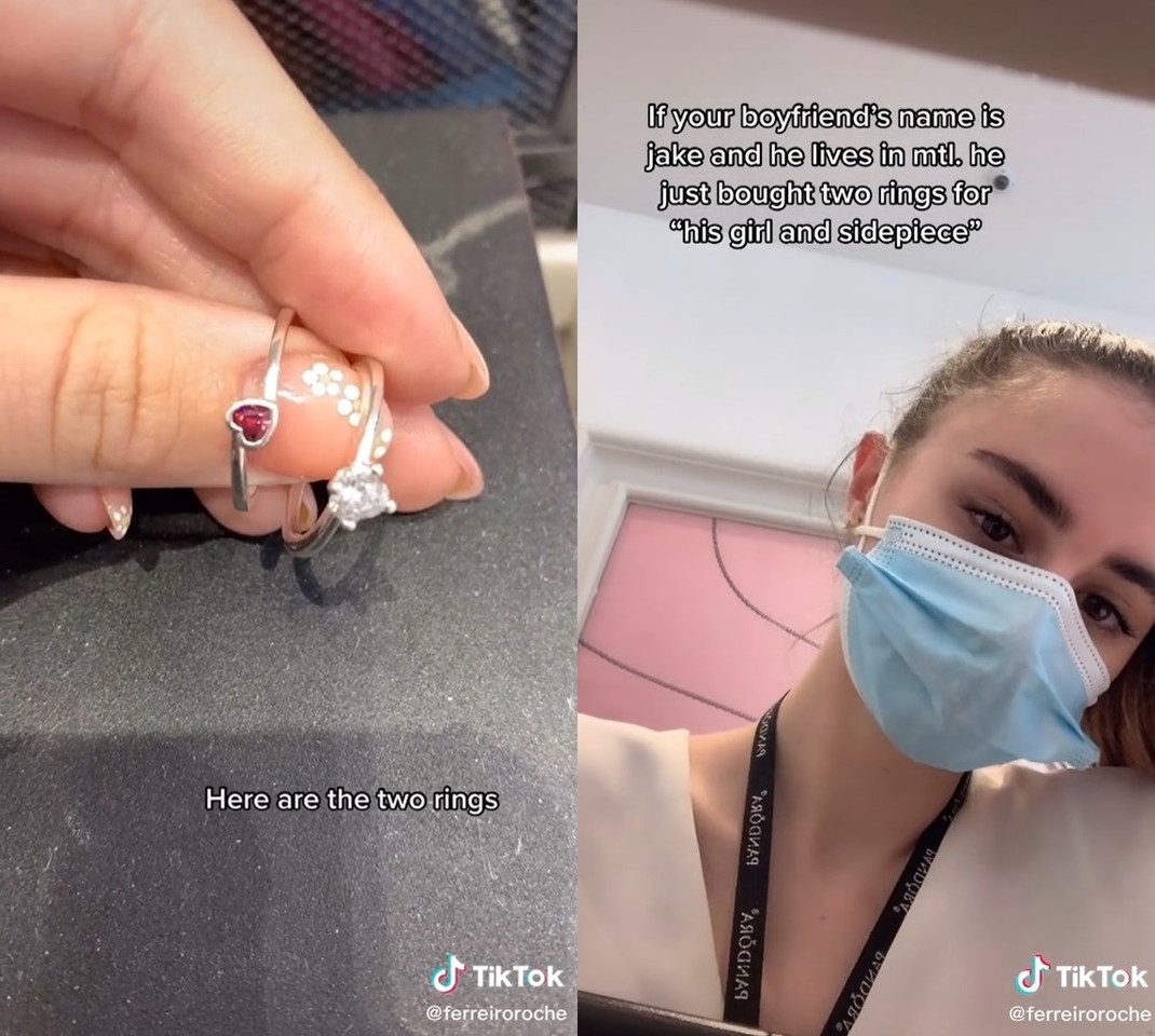 加拿大最近有一個名叫愛麗(Eli)的女子聲稱,自己在著名珠寶店潘多拉(Pandora)工作時,有一名自稱為傑克(Jake)的男子同時為女友和小三買了2枚戒指。愛麗將揭發傑克偷吃的影片上傳到TikTok,希望透過網路的力量,告誡傑克的女友避免受騙。