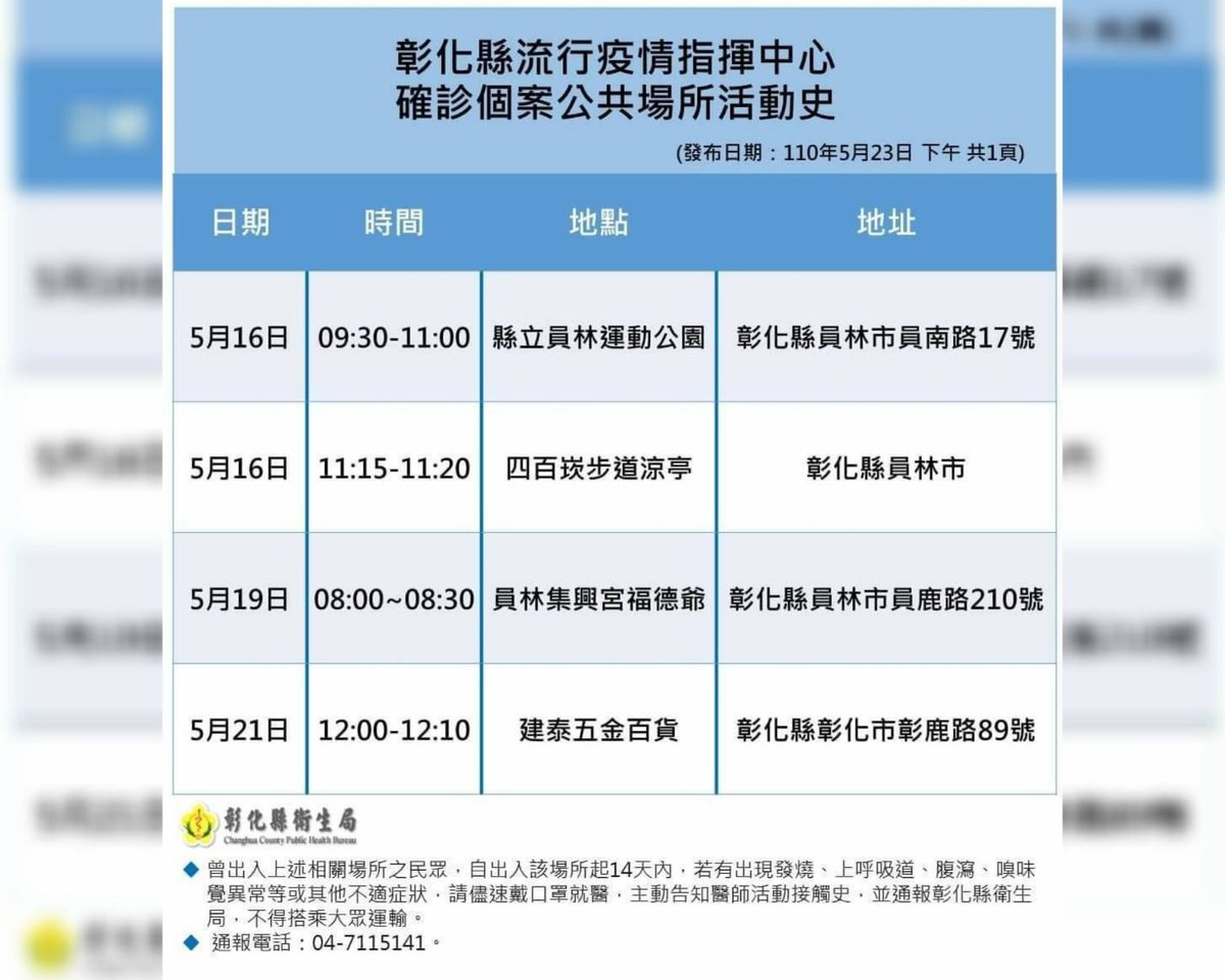 彰化縣衛生局昨(23)日公布確診者新的4處足跡,有3處在員林市、1處在彰化市,包括員林市員南路運動公園、四百崁步道涼亭、集興宮福德爺廟及彰化市的建泰五金百貨等處,衛生局呼籲去過這些足跡點的民眾請提高警覺,做好自主健康管理,發現症狀速就醫採檢。