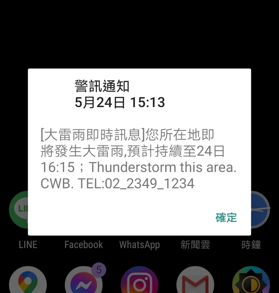 今(24)日下午3點13分,國家警訊響了!中央氣象局針對台北市、新北市和南投縣民眾發出「災防告警系統」(PWS)訊息,「您所在地即將發生大雷雨」,預計會持續至下午4點15分。