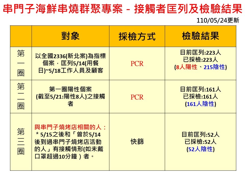 新北市一名67歲男子曾赴萬華茶室,14日到左營區一家燒烤店用餐後,16日確診,沒想到這晚在燒烤店聚餐的包廂客人加上員工,已有8人因此染疫,高市府視此為一起餐廳群聚案件,共計匡列3圈接觸者,共計436人。高雄市衛生局24日公布檢驗結果,436人中,除了8名已公布確診個案外,其餘採檢結果皆為陰性。