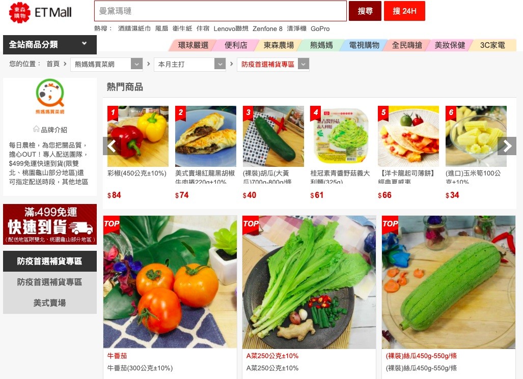 東森購物ETmall旗下生鮮電商「熊媽媽買菜網」主打新鮮蔬果,品項數達1萬件,其中有將近5,000件是冷藏、冷凍生鮮品項,蔬菜也都會做農藥殘留檢測並公布於購買頁面上,自疫情增溫後,統計業績已成長4~5倍,消費者大多訂購蔬菜、肉類,其中各式新鮮葉菜及當季水果最夯,並以新北地區配送最多;快速到貨服務部分,每日配送量能固定,過去消費者下訂最快4小時送達,最慢1~2天到貨,現在因為訂單量暴增,若消費者選擇配送時段剛好運量滿額,則需往後選擇,約等待3~5天到貨。