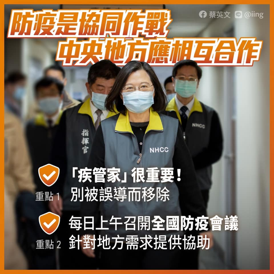 蔡英文說,指揮中心除了針對地方的需求,來滾動檢討做法、提供必要協助外,也在每天上午加開記者會,對外說明協調處理的事項,「我要再強調一次,防疫是協同作戰,我們有討論機制、有互助系統,有任何問題,就透過管道來處理、來解決,現在最不需要的就是彼此對抗」。