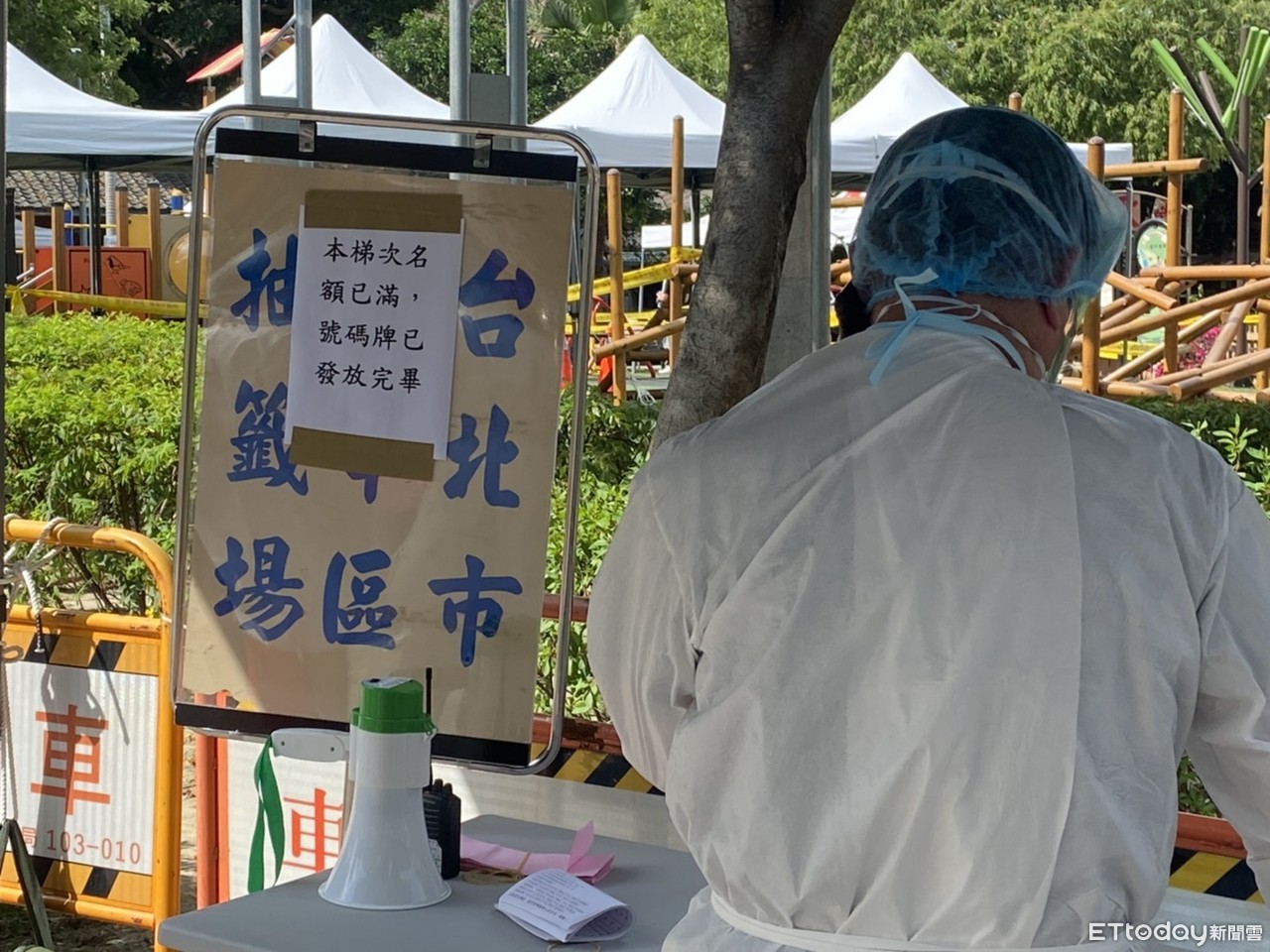 ▲快篩站號碼牌發放完畢的畫面。(圖/記者陳煥丞攝)