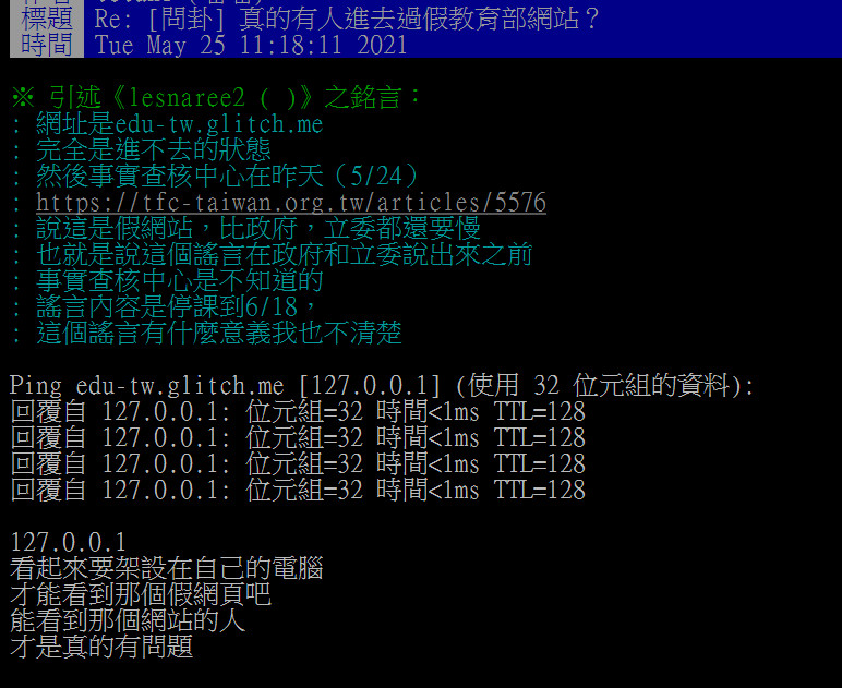 一席話釣出理科背景的網友,直言「看起來要架設在自己的電腦,才能看到那個假網頁吧!能看到那個網站的人,才是真的有問題。」