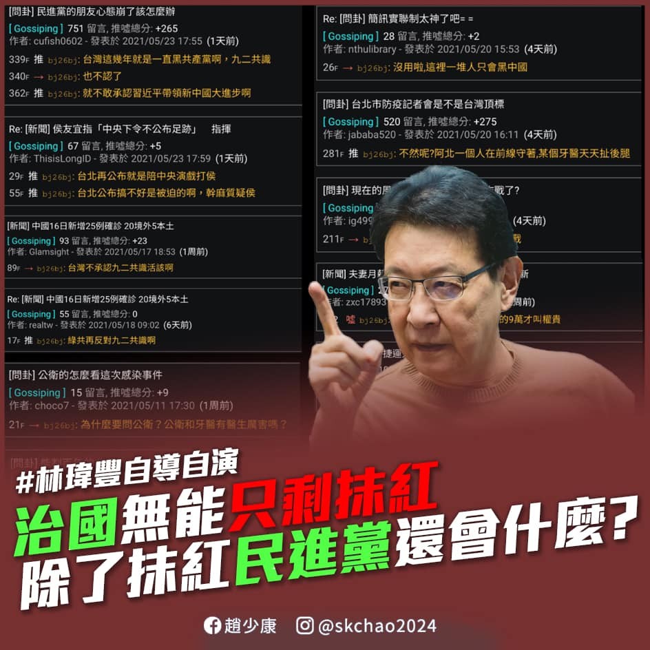 民進黨立委王定宇日前指控,中國網軍正在進行對台認知戰,結果卻被揪出,在PTT上散布消息的人就是親綠寫手林瑋豐,引發網路熱議。對此,資深媒體人趙少康痛批,民進黨身為執政黨,還在玩這種卑鄙無恥的手法,赤裸裸的網軍操作一條龍,到底藉此抹黑了多少忠良?