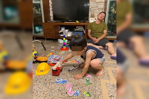 這名女子日前在「爆怨2公社」貼文,替丈夫打氣,「老公撐下去!再五天!」依據照片畫面,丈夫生無可戀地癱坐在地上,兒子則開心拿著玩具玩耍,且玩具們撒落在地上,看起來玩得十分開心。