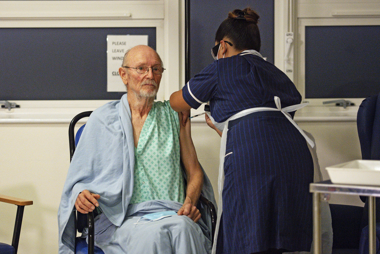 ▲英國81歲的威廉·莎士比亞去年底在醫院接種輝瑞公司的新冠疫苗。(圖/達志影像/美聯社)