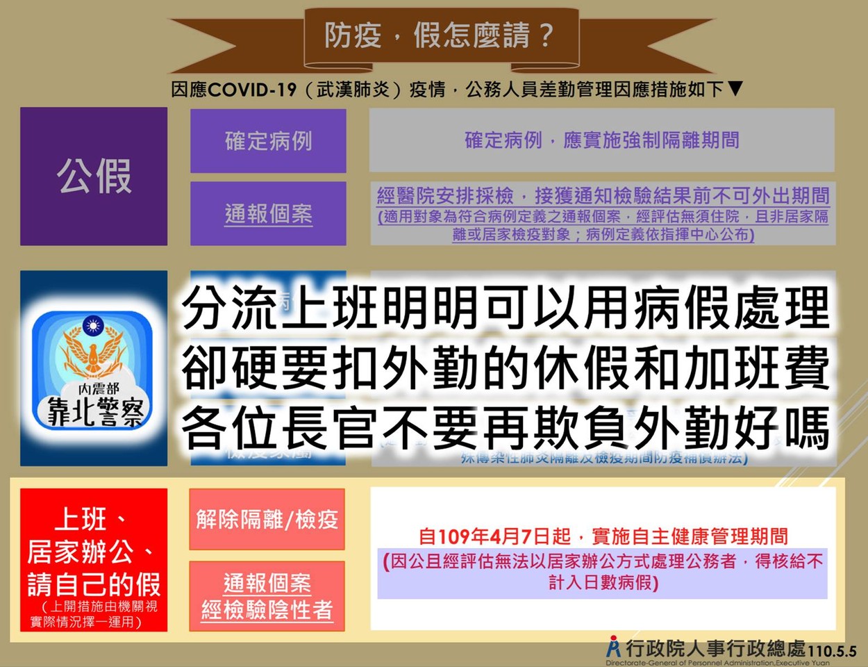 台灣新冠肺炎(COVID-19)疫情嚴峻、臉書「靠北警察」26日傍晚6點有基層警員反映目前包含雙北市及部分縣市警局都開始有「分流上班強迫警員請休假不然扣錢」的惡劣管理現象,包含雙北市、臺中、臺南、宜蘭、南投警局都開始要求基層警員分兩組上班,但分流拆班在家警員卻得自己請假請補休,甚至要求扣加班時數。