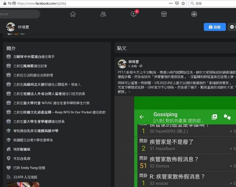 林瑋豐表示,PTT八卦板在5月24日出現鼓吹封鎖、刪除疾管家LINE帳號的文章,他閱讀後,截圖到私人臉書批評討論。他說,PTT有關疾管家的討論,他沒有任何發文及推文,透過站方紀錄或工具網站可查詢,5月24日當天,在PTT除了上站,根本沒有其他活動紀錄。