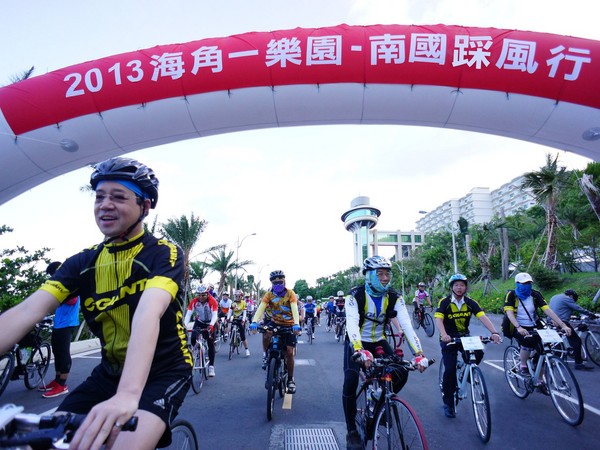南國踩風行27日早上6時30分開騎,立委蘇震清、邱志偉、許智傑到場為加油打氣,換上帥氣的車衣勁裝,在核三廠附近的海角一樂園,和車友們一起享受風速快感。