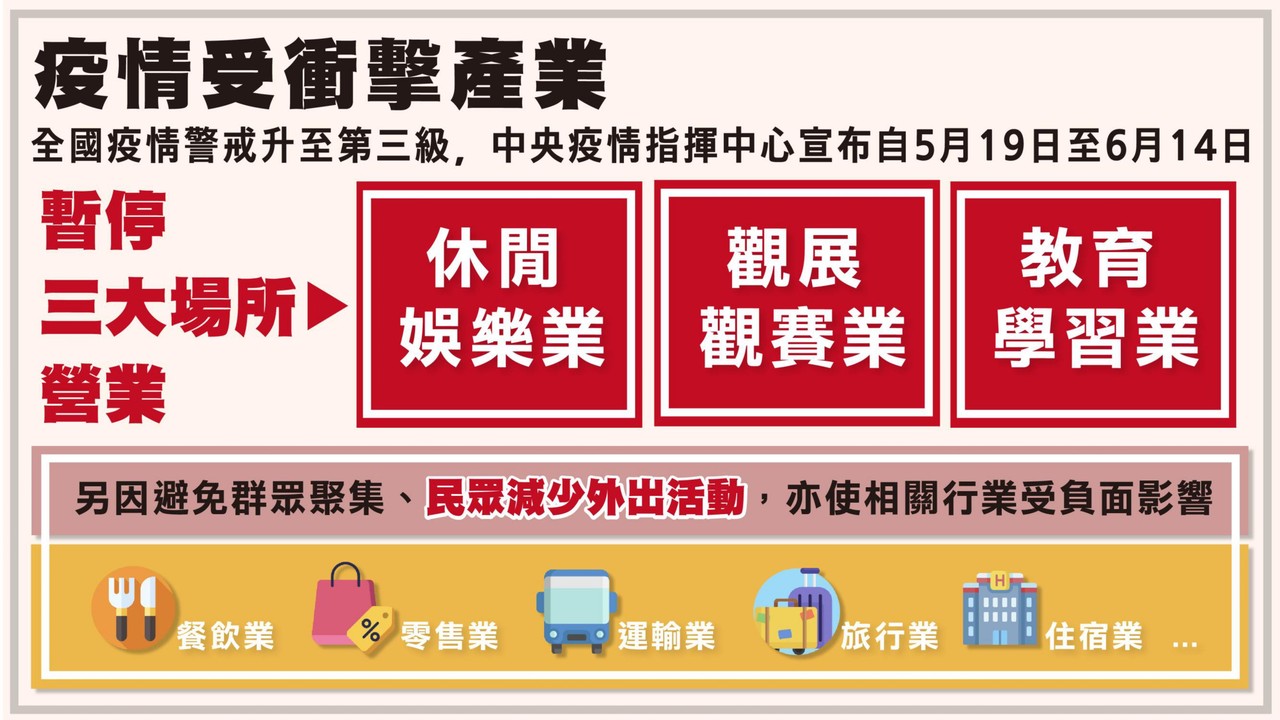 二、加強對產業支持措施:聚焦協助受疫情警戒升至第三級而暫停營業場所及相關受影響產業,立即寬列相關營運資金及薪資補貼,加強支援力道,協助產業度過低潮。