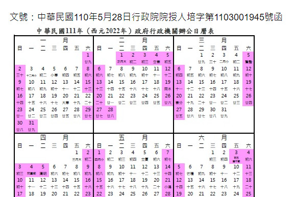 行政院人事行政總處表示,行政院依「紀念日及節日實施辦法」、「公務人員週休二日實施辦法」及「政府機關調整上班日期處理要點」等規定,核定2022年政府行政機關辦公日曆表,總放假日數115日。