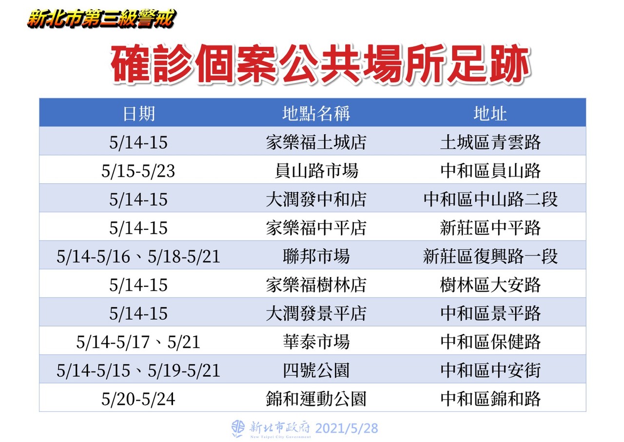 中央流行疫情指揮中心28日公布新北市新增136例,校正回歸141例,共277例,目前累積2887例。新北市長侯友宜公布確診者足跡與熱區,包括3家樂福、2大潤發、3菜市場。