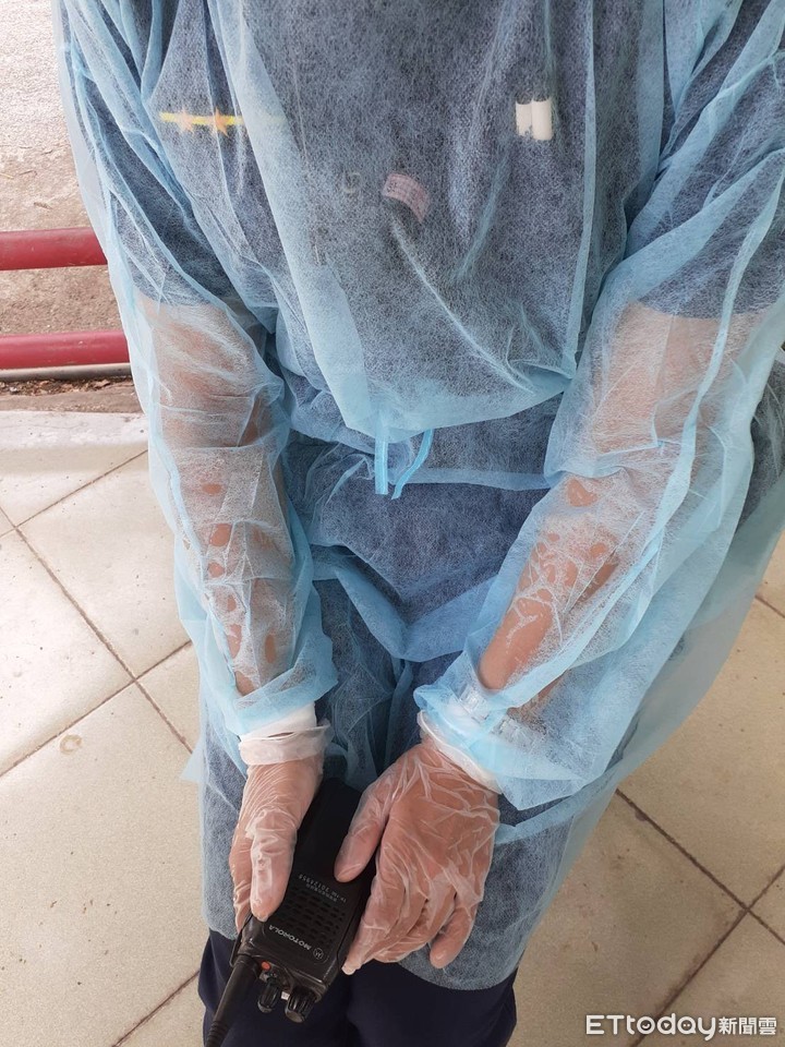 ▲▼潮州警頂著高溫,穿全套防護衣在快篩站執勤,渾身汗,手被汗水泡白泡皺。(圖/記者陳崑福翻攝,以下同)