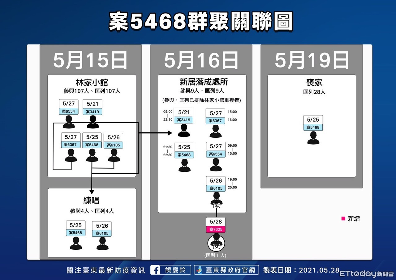 饒慶鈴在28日疫情說明記者會中指出,確診案7325(20多歲、金峰鄉人、案6105女兒),為太麻里林家小館餐宴案延伸,5月18日從高雄搭火車至太麻里,由家人接回金峰鄉,至5月24日皆在住家附近商店購物,5月25日出現發燒症狀。