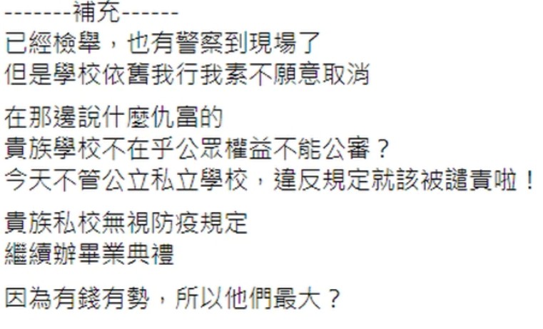 一名網友在臉書《Gangs of Tian Mu 天母幫》指控,今日天母某私立高中疑似不甩三級疫情警戒規定,照常舉辦畢業典禮,讓原PO傻眼直呼,「校園一直傳來歡呼聲!」隨著事情越演越烈,附近居民已報案處理,原PO轉述校方說法,「沒有辦畢業典禮,全程戶外,場內只有9人」,甚至還疑似嗆聲檢舉民眾「仇富」!此話一出,讓原PO難以接受,「早上還下雨,下雨還必須在戶外,真的是很委屈吧!」