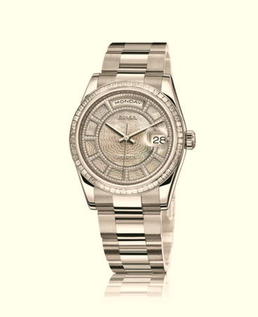 鑲有方型鑽石的外圈也是此次推出的7款新DAY-DATE的共同特徵。勞力士還引入新穎的珠寶設計,將最珍貴的金屬和璀璨寶石完美結合。新款蠔式恒動LADY-DATEJUST PEARLMASTER的錶殼與錶帶用18 ct永恆玫瑰金製成,配有18ct白色黃金外圈與錶帶鏈節,鑲有頂級鑽石。這款珠寶腕表華麗無比,其錶面上飾有黑色或白色珍珠母,並鑲嵌粉紅金色蓮花圖案。