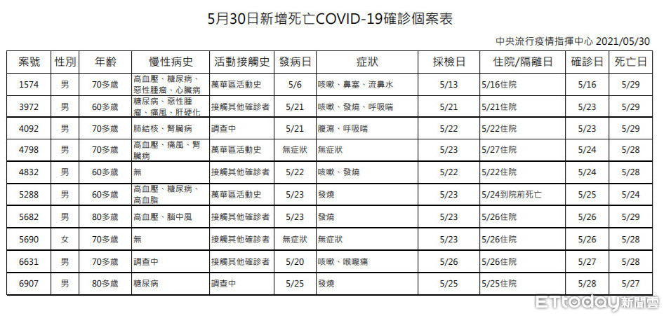 指揮中心說明,今日新增10例死亡個案(案1574、3972、4092、4798、4832、5288、5682、5690、6631、6907),共計為男性9位、女性1位,年齡介於60多歲至80多歲,發病日介於5月6日至5月25日,確診日介於5月16日至5月28日,死亡日期介於5月24日至5月29日。