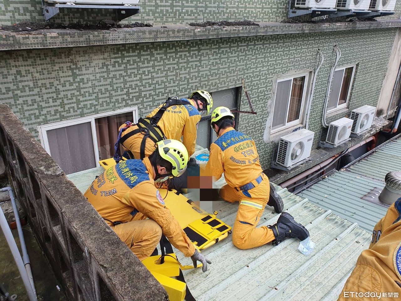 ▲男子墜樓至隔壁建築3樓屋頂。(圖/民眾提供)