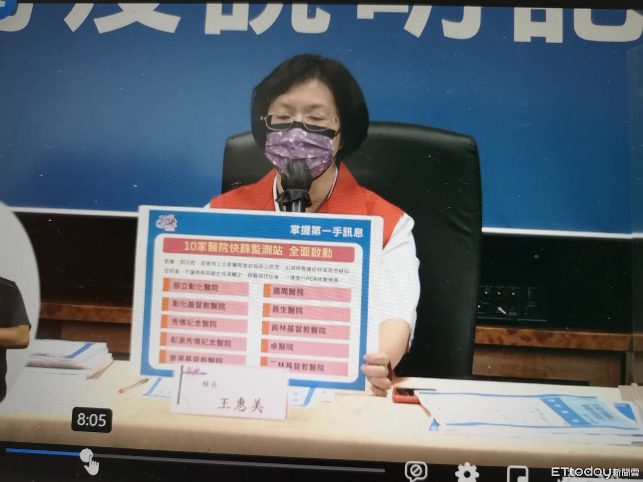 王惠美表示,為因應快速圍堵疫情,自即日起彰化縣全面啟動社區快篩監測站,總共有10家醫院都有設PCR的核酸檢測,包含彰化基督教醫院、二林基督教醫院、鹿港基督教醫院、員林基督教醫院、衛生福利部彰化醫院、秀傳紀念醫院、彰濱秀傳紀念醫院、員生醫院、道周醫院、卓醫院,從今天開始不論有沒有旅遊史或接觸史,只要民眾有呼吸道或有其他疑似症狀,需要到這些醫院做檢驗時,經醫師評估以後,一律進行PCR核酸檢測。