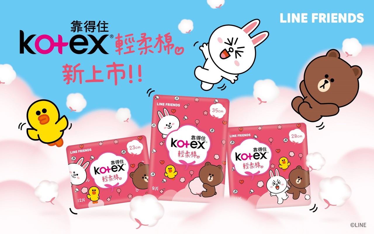 喜愛熊大與兔兔的粉絲有福了,Kotex靠得住攜手超人氣BROWN & FRIENDS推出全新包裝,讓熊大、兔兔躍上全系列輕柔棉!鮮豔桃紅的亮眼色系搭配表情超Q萌的高人氣BROWN & FRIENDS角色熊大、兔兔與莎莉,可愛感大爆棚,讓人完全無法抗拒!包裝新升級的Kotex輕柔棉BROWN & FRIENDS系列共有三種長度,分別是23公分、28公分與35公分,自5月起已陸續攻占各大通路賣場貨架,少女們看了紛紛驚呼「好期待生理期來到」、「可愛到捨不得拿來用」!