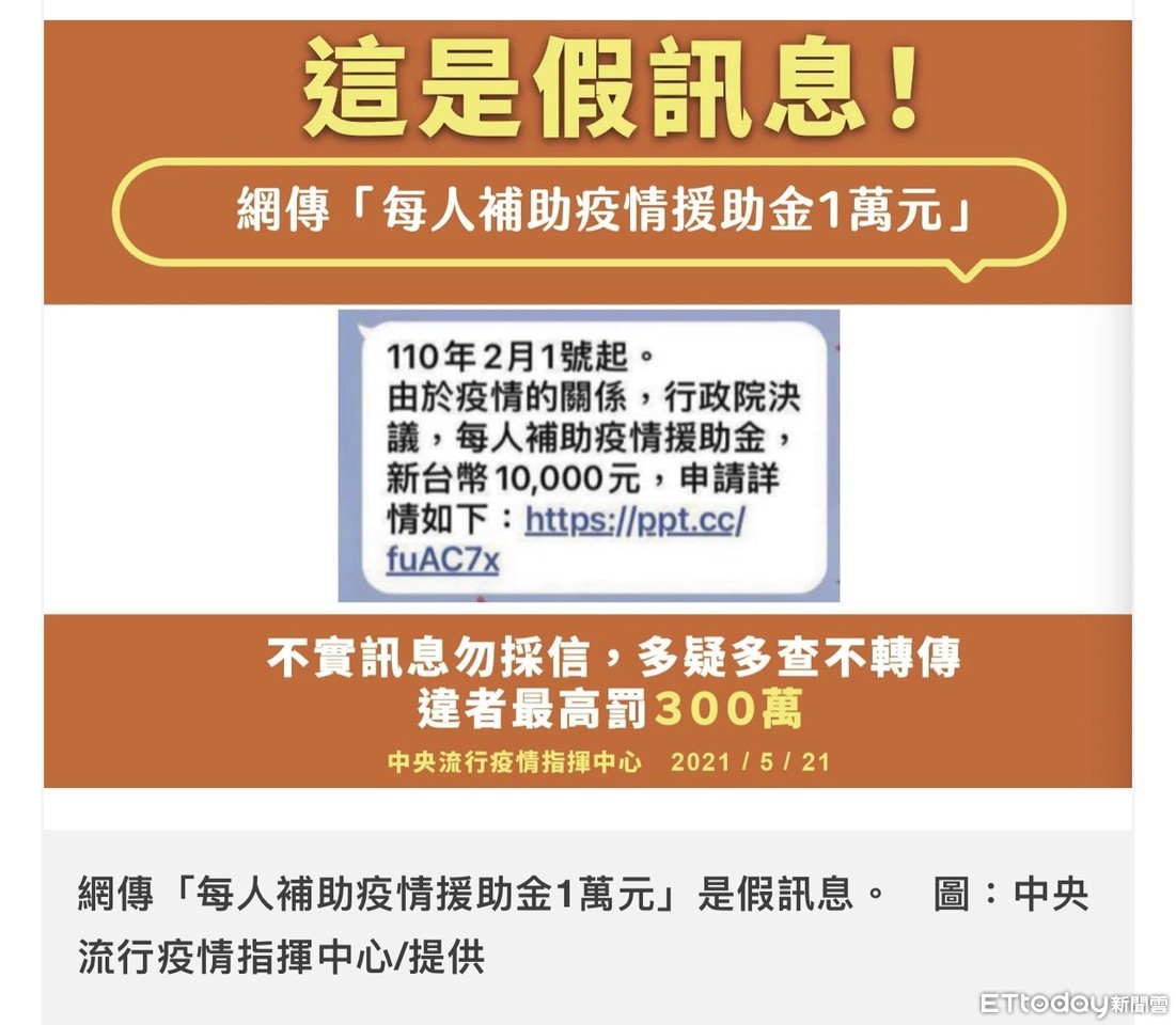 警方呼籲,疫情相關資訊應以中央疫情指揮中心公布為主,衛生福利部官方粉專也在5月21日就製作宣導圖卡,指出「每人疫情援助金10000元」為假訊息;民眾接獲來源不明的疫情訊息時,應先進行查證,切勿隨意散播、轉傳,以免觸法,否則依法最高可罰300萬,或3年以下有期徒刑、拘役。