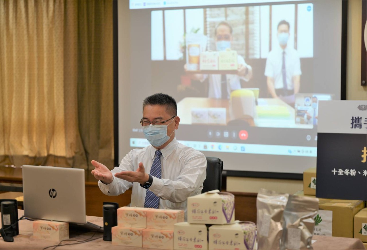 慈濟慈善事業基金會執行長顏博文2日特別與內政部長徐國勇視訊連線,主動捐贈防護面罩3萬片,十全冬粉、米粉、餅乾各3萬包,及本草飲、紫錐花等防疫生活物資一批。