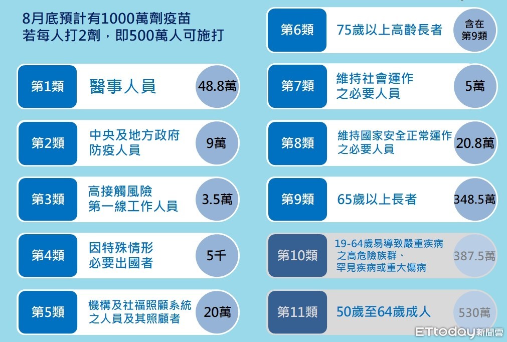 若以8月可到貨的1000萬劑,且每人都打2劑的情況下來計算,等於僅有500萬人可以施打到疫苗。COVID-19疫苗公費接種對象累計至第九類的「65歲以上長者」後,已有456萬餘人,因此第十類、第十一類可能就無法施打到,遑論其他不在公費接種對象名單上的其他人。