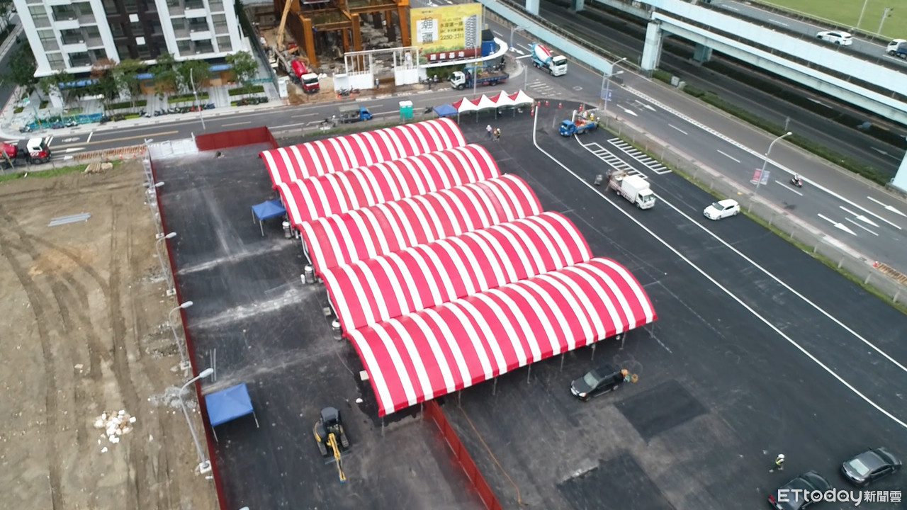 ▼板橋江子翠大型疫苗接種兼快篩站,今全力趕工架設中。(圖/記者許靖騏攝,下同)