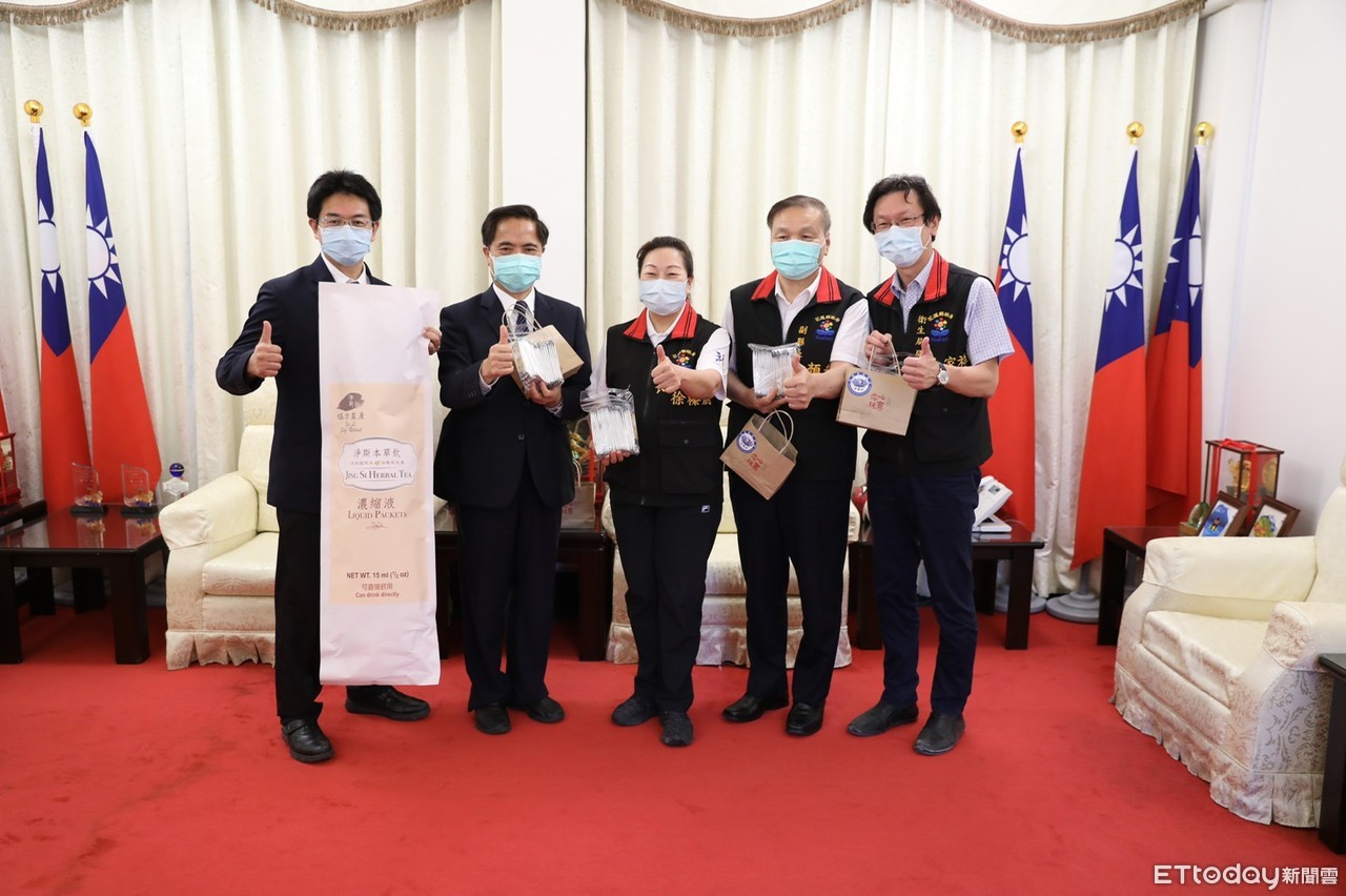 ▲花蓮慈院林欣榮院長(左二)等,贈淨斯本草飲濃縮液給花蓮縣府團隊。(圖/慈濟醫學中心提供)