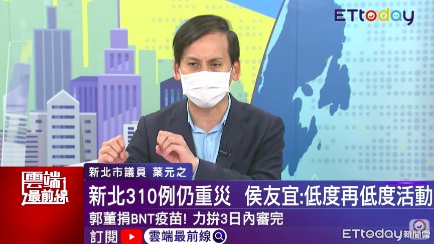 國內疫情持續蔓延,此波疫情也燒出台灣的「疫苗荒」,近日包含鴻海創辦人郭台銘、佛光山都紛紛出手,盼助政府採購疫苗。對此,國民黨新北市議員葉元之3日在ETtoday《雲端最前線》節目中呼籲,政府應該站在一個「協助者」角色,與郭台銘、佛光山「公私協力」,更積極的促成,而非等到所有事情辦好後,再扮演一個「核准或不核准」的角色。